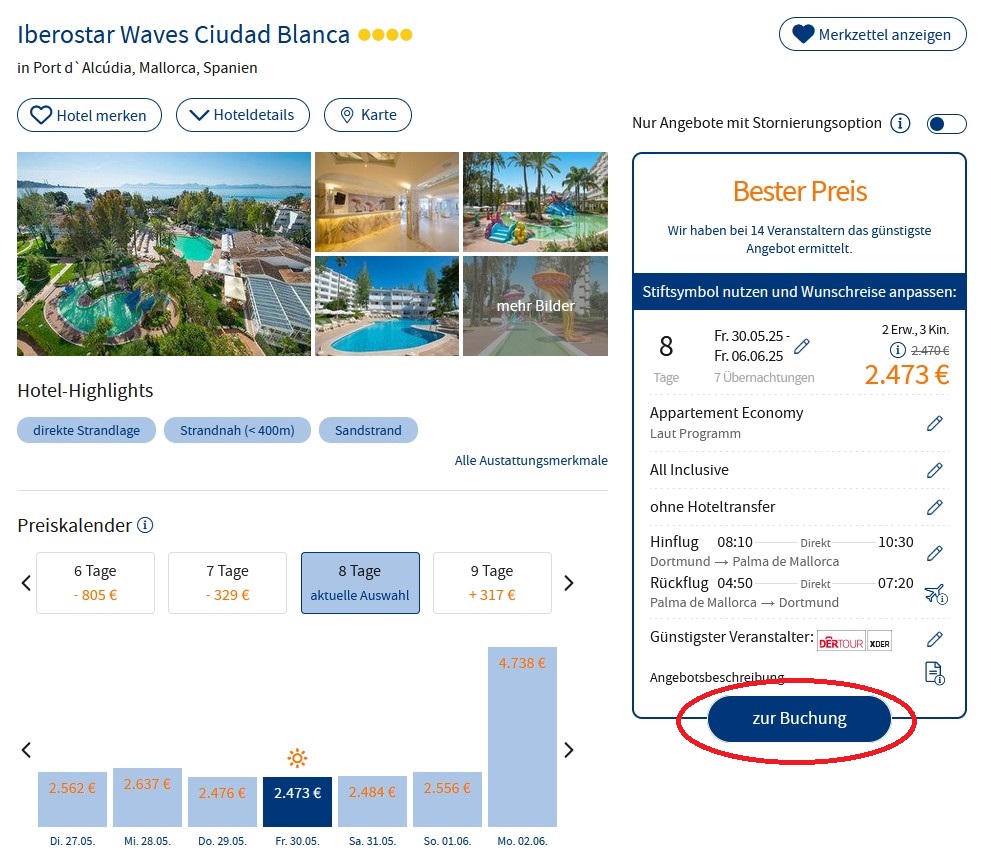 So könntest du eine (Pauschal-)Reise buchen. Dies ist eine beispielhafte Buchung.